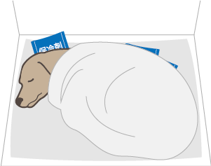 保冷効果を考えると、発砲スチロール箱の様なものが最適ですが、大きなペットの場合には体が収まるサイズの箱等がない場合もあるかもしれません。その場合は、ペットの体を無理にまげて押し込むようなことは避けて下さい。体液などの対策を考えてビニールシートや、ごみ袋などを何枚か敷き詰め、水漏れを防いだうえで毛布やバスタオル等の上にやさしく安置して下さい。 - ③ 保冷剤・氷 ※ドライアイスにはご注意ください